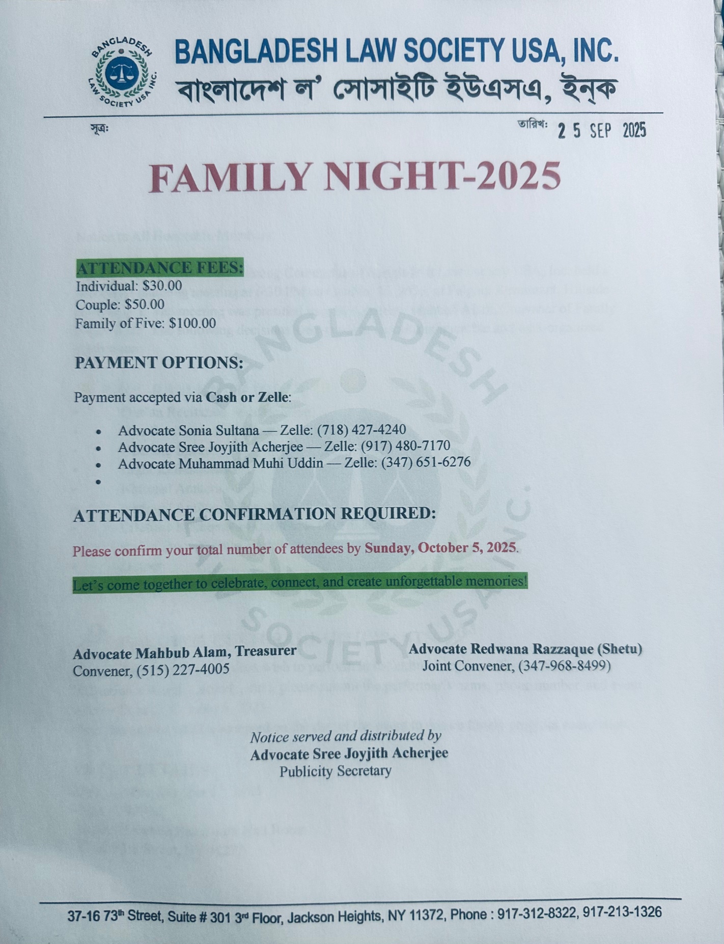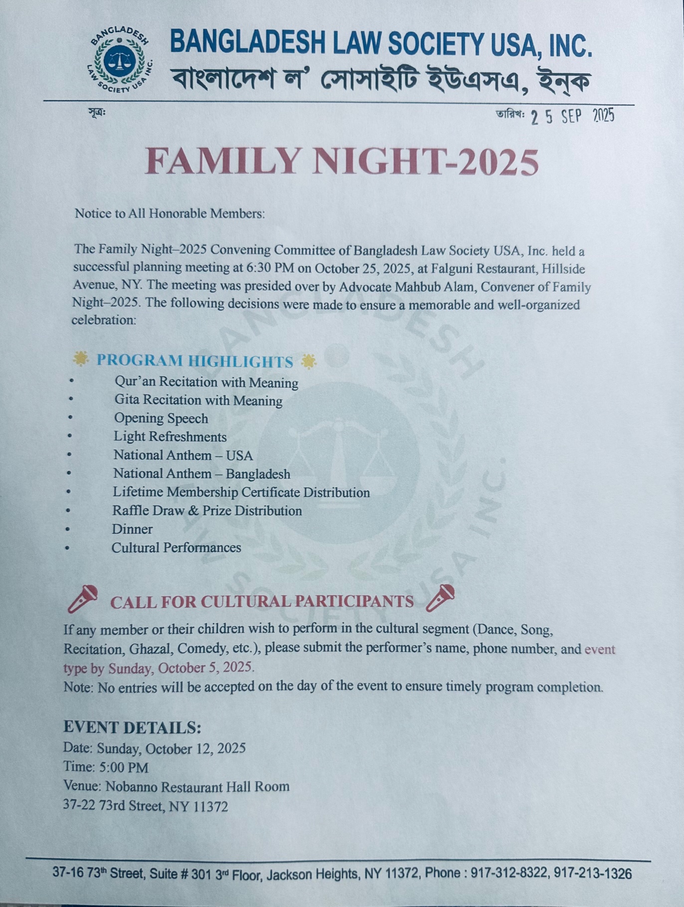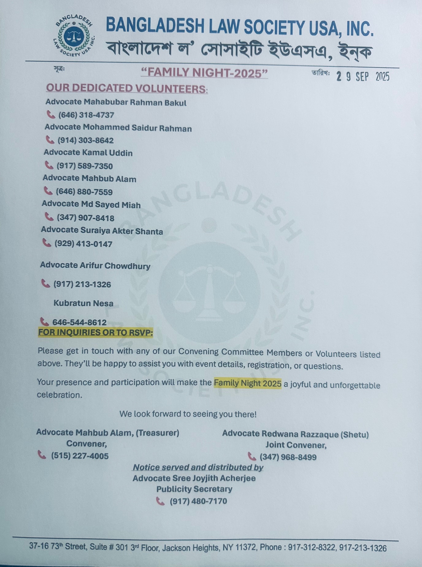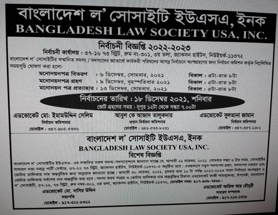Bangladesh Law Society USA Inc (BLS) is a non-profit, voluntary, nonpolitical, professional,and secular forum organized exclusively for cultural, educational and charitable purposes. It qualifies under Section 501 (c) (3) of the internal revenue code as a non-profit organization.